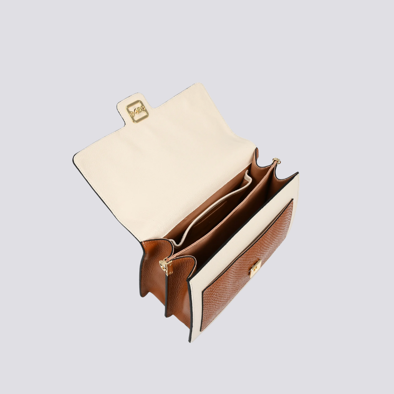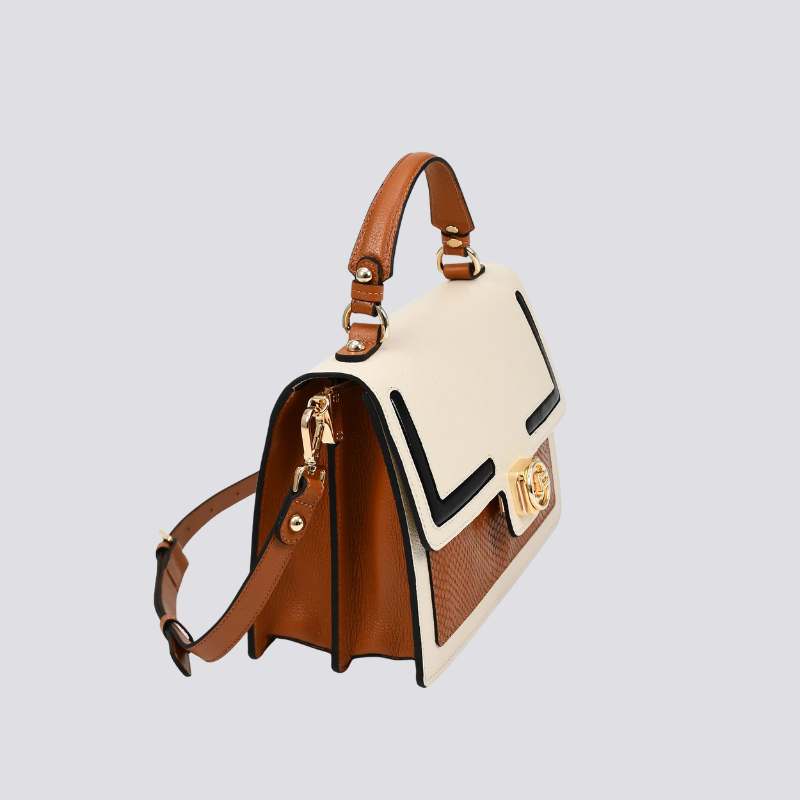 Confeccionada em couro premium, apresenta estrutura firme e acabamento impecável, trazendo durabilidade e presença. O mix de cores neutras com detalhes em preto e caramelo adiciona um toque refinado e atemporal, facilitando combinações com diferentes looks. A alça superior oferece praticidade no dia a dia, e a alça longa permite uso transversal, garantindo conforto e liberdade de movimento.