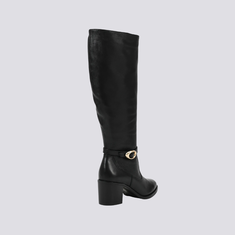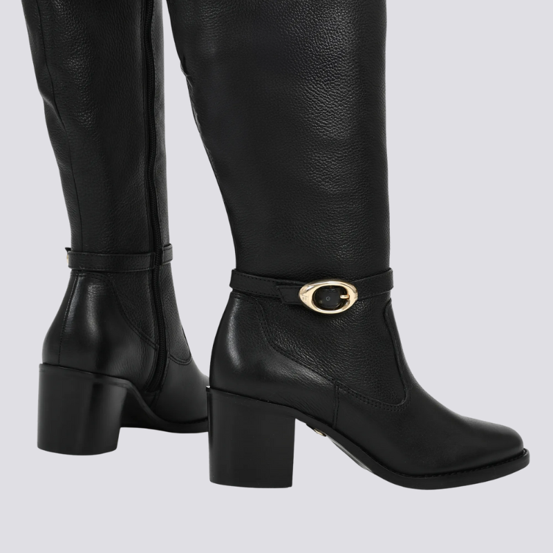 O cano alto oferece um toque clássico ao look, enquanto o salto bloco proporciona estabilidade, permitindo uso prolongado com conforto. O detalhe metálico discreto na altura do tornozelo adiciona charme moderno sem exageros, tornando a peça ainda mais versátil.
