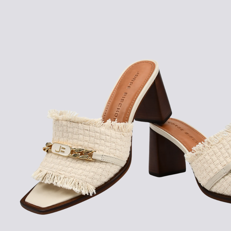 O tamanco, confeccionado em tecido texturizado com acabamento desfiado, traz um toque artesanal e contemporâneo. Seu salto bloco proporciona conforto e presença, enquanto o detalhe em metal agrega refinamento à composição.