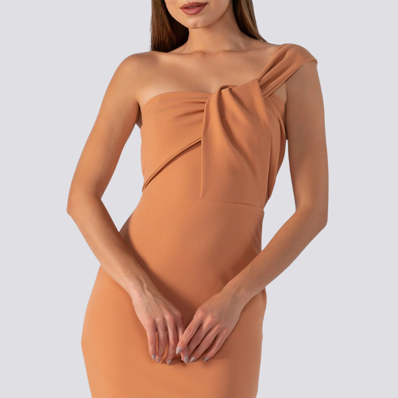 Seu design apresenta decote assimétrico transpassado, que valoriza o colo com refinamento, enquanto a modelagem midi ajustada desenha a silhueta de forma impecável, conferindo um visual marcante e feminino. Ideal para ocasiões especiais, jantares, eventos formais ou momentos em que você deseja transmitir confiança e estilo.